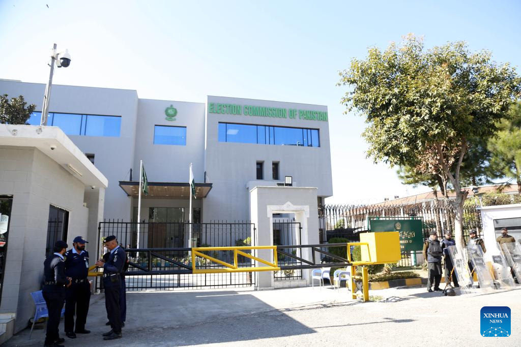 Security personnel stand guard in front the building of the Election Commission of Pakistan in Islamabad, capital of Pakistan on Feb. 9, 2024. The voting process in Pakistan's parliamentary elections concluded Thursday evening and the counting of ballots has started, said a statement from the Election Commission of Pakistan (ECP). (Xinhua/Ahmad Kamal)