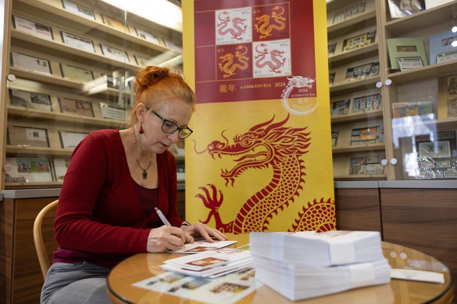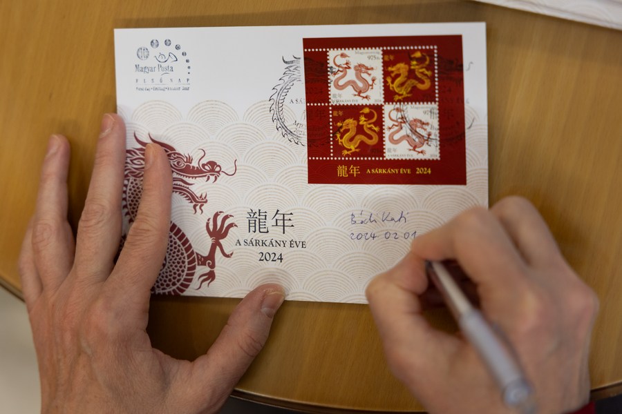 Katalin Bodi, the Hungarian designer of the Year of the Dragon commemorative stamp recently issued by the Hungarian Post, signs on a first-day cover with the stamps of the Year of the Dragon in Budapest, Hungary, on Feb. 7, 2024. (Photo by Attila Volgyi/Xinhua)