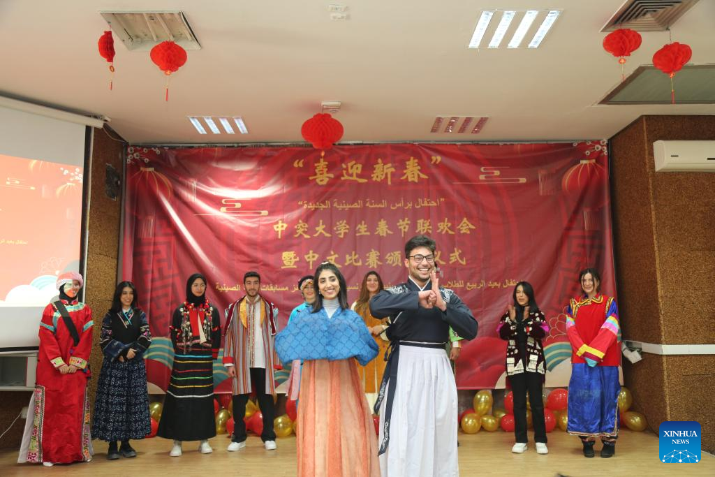 Tunisian students participate in a costumes show during a Spring Festival gala in Tunis, Tunisia, on Feb. 7, 2024. The Confucius Institute of the University of Carthage and the Higher Institute of Languages (ISLT) jointly held a Spring Festival gala for Chinese and Tunisian students here on Wednesday. (Xinhua)