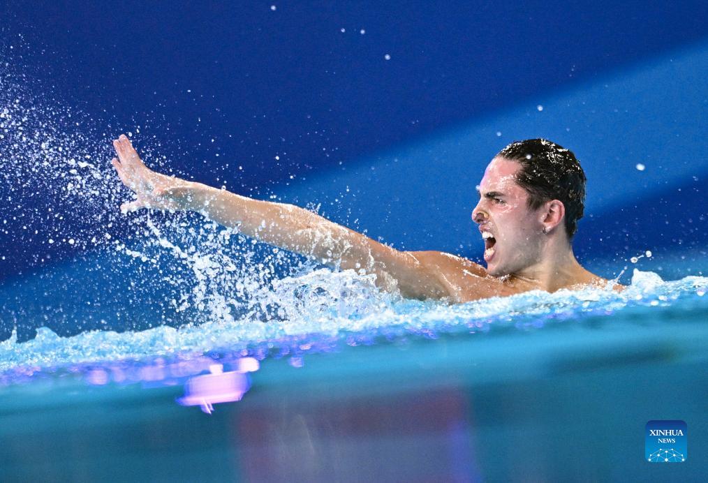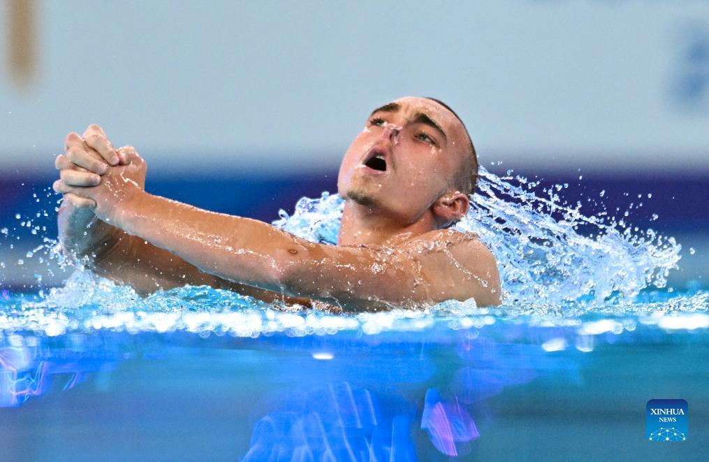 Giorgio Minisini of Italy performs during the men's solo free final of artistic swimming at the World Aquatics Championships in Doha, Qatar, Feb. 7, 2024. (Xinhua/Xia Yifang)