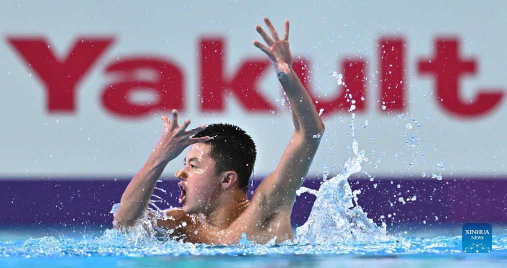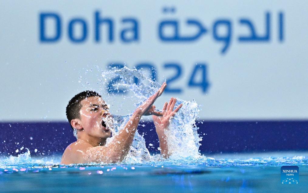 Yang Shuncheng of China performs during the men's solo free final of artistic swimming at the World Aquatics Championships in Doha, Qatar, Feb. 7, 2024. (Xinhua/Xia Yifang)