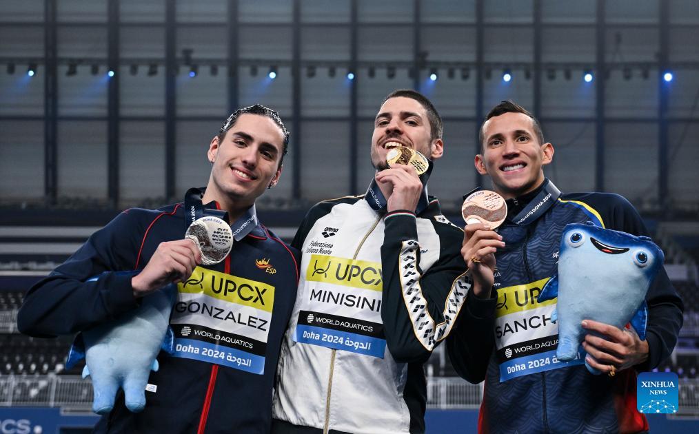 Gold medalist Giorgio Minisini (C) of Italy, silver medalist Dennis Gonzalez Boneu (L) of Spain and bronze medalist Gustavo Sanchez of Colombia pose for photos after the awarding ceremony for men's solo free of artistic swimming at the World Aquatics Championships in Doha, Qatar, Feb. 7, 2024. (Xinhua/Xia Yifang)