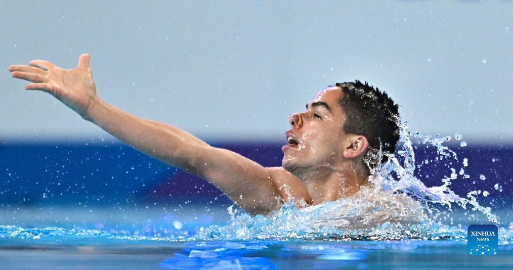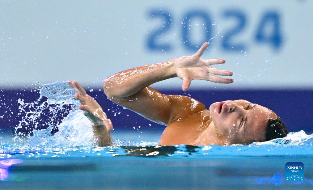 Dennis Gonzalez Boneu of Spain performs during the men's solo free final of artistic swimming at the World Aquatics Championships in Doha, Qatar, Feb. 7, 2024. (Xinhua/Xia Yifang)