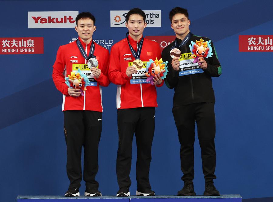 Wang Zongyuan of China poses with his medal after the men's 3m springboard final of diving at the World Aquatics Championships 2024 in Doha, Qatar, Feb. 7, 2024. (Xinhua/Luo Yuan)Gold medalist Wang Zongyuan (C) of China, silver medalist Xie Siyi (L) of China and bronze medalist Osmar Olvera Ibarra of Mexico attend the awarding ceremony for the men's 3m springboard of diving at the World Aquatics Championships 2024 in Doha, Qatar, Feb. 7, 2024. (Xinhua/Luo Yuan)Wang Zongyuan of China reacts before the awarding ceremony for the men's 3m springboard of diving at the World Aquatics Championships 2024 in Doha, Qatar, Feb. 7, 2024. (Xinhua/Luo Yuan)Wang Zongyuan (R) watches his training video before the men's 3m springboard final of diving at the World Aquatics Championships 2024 in Doha, Qatar, Feb. 7, 2024. (Xinhua/Luo Yuan)Wang Zongyuan of China competes during the men's 3m springboard final of diving at the World Aquatics Championships 2024 in Doha, Qatar, Feb. 7, 2024. (Xinhua/Luo Yuan)Wang Zongyuan of China competes during the men's 3m springboard final of diving at the World Aquatics Championships 2024 in Doha, Qatar, Feb. 7, 2024. (Xinhua/Luo Yuan)Wang Zongyuan of China competes during the men's 3m springboard final of diving at the World Aquatics Championships 2024 in Doha, Qatar, Feb. 7, 2024. (Xinhua/Luo Yuan)■