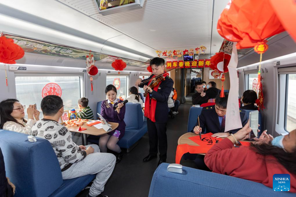 A staff member plays the violin for passengers during a Spring Festival celebration event on the train G1426, Feb. 9, 2024. People across the country held various celebrations on Friday, the Chinese Lunar New Year's eve, to welcome the traditional festival. (Xinhua/Wang Xiang)