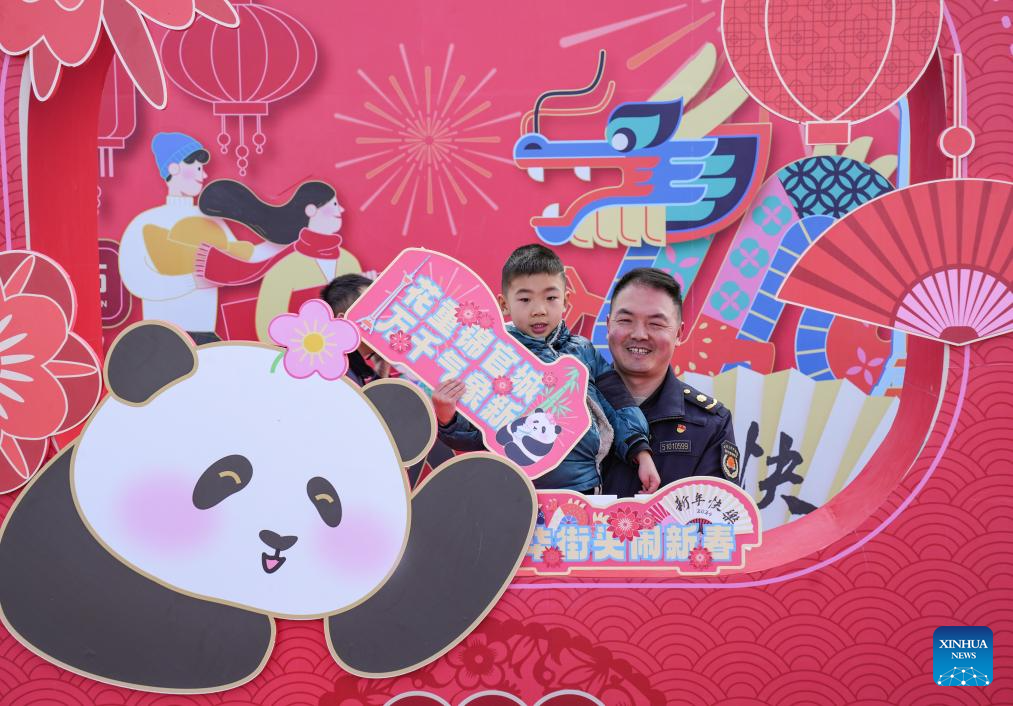 Passengers pose for photos with a Spring Festival decorative installation at Chengdu East Railway Station in Chengdu, southwest China's Sichuan Province, Feb. 9, 2024. People across the country held various celebrations on Friday, the Chinese Lunar New Year's eve, to welcome the traditional festival. (Xinhua/Wang Xi)