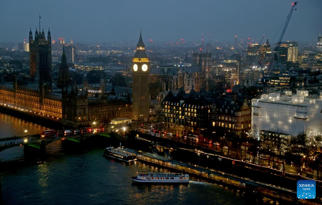 This photo taken on Feb. 8, 2024 shows a view of the Elizabeth Tower, more commonly known as Big Ben, during the twilight in London, Britain. (Xinhua/Li Ying)