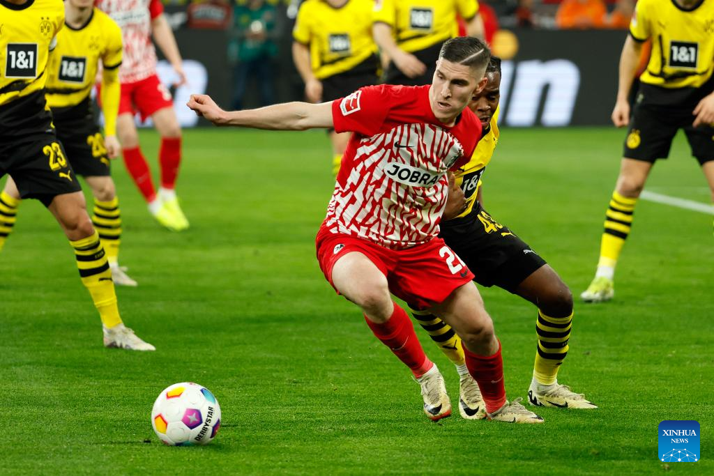 Roland Sallai (L) of Freiburg competes during the first division of Bundesliga match between Borussia Dortmund and Freiburg in Dortmund, Germany, on Feb. 9, 2024. (Photo by Joachim Bywaletz/Xinhua)