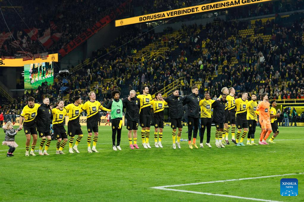 Team members of Borussia Dortmund greet audience after the first division of Bundesliga match between Borussia Dortmund and Freiburg in Dortmund, Germany, on Feb. 9, 2024. (Photo by Joachim Bywaletz/Xinhua)