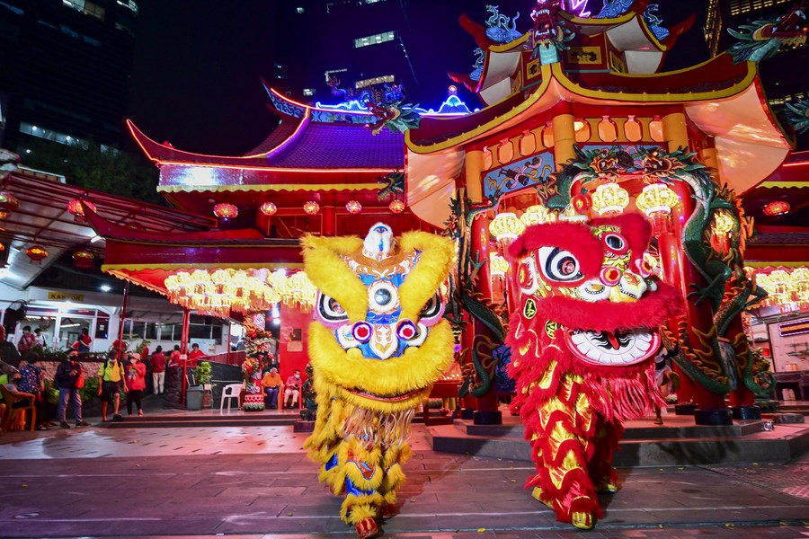 A lion dance team perform to celebrate the Chinese Lunar New Year in Amurva Bhumi temple in Jakarta, Indonesia, Feb. 9, 2024. (Xinhua/Zulkarnain)