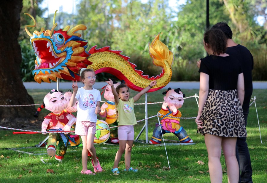 People pose for photos in front of decorations during a Chinese Lunar New Year celebration at Hagley Park in Christchurch, New Zealand, Feb. 9, 2024. (Xinhua/Meng Tao)