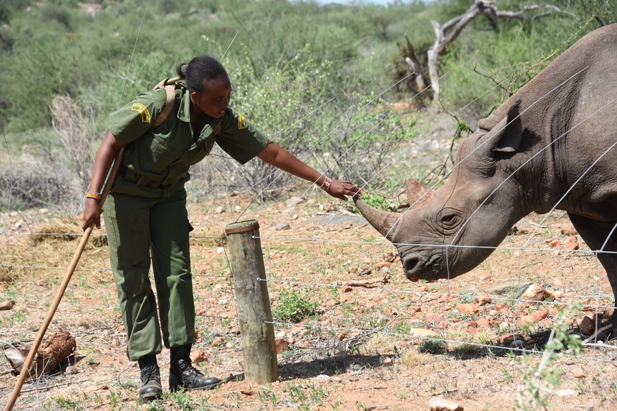 The file photo shows Salome Lemalasia, a ranger aged 30, taking care of a six-year-old black rhino named Loijipu at Sera Community Conservancy in Samburu County, Kenya, May 11, 2022. (Photo by John Okoyo/Xinhua)