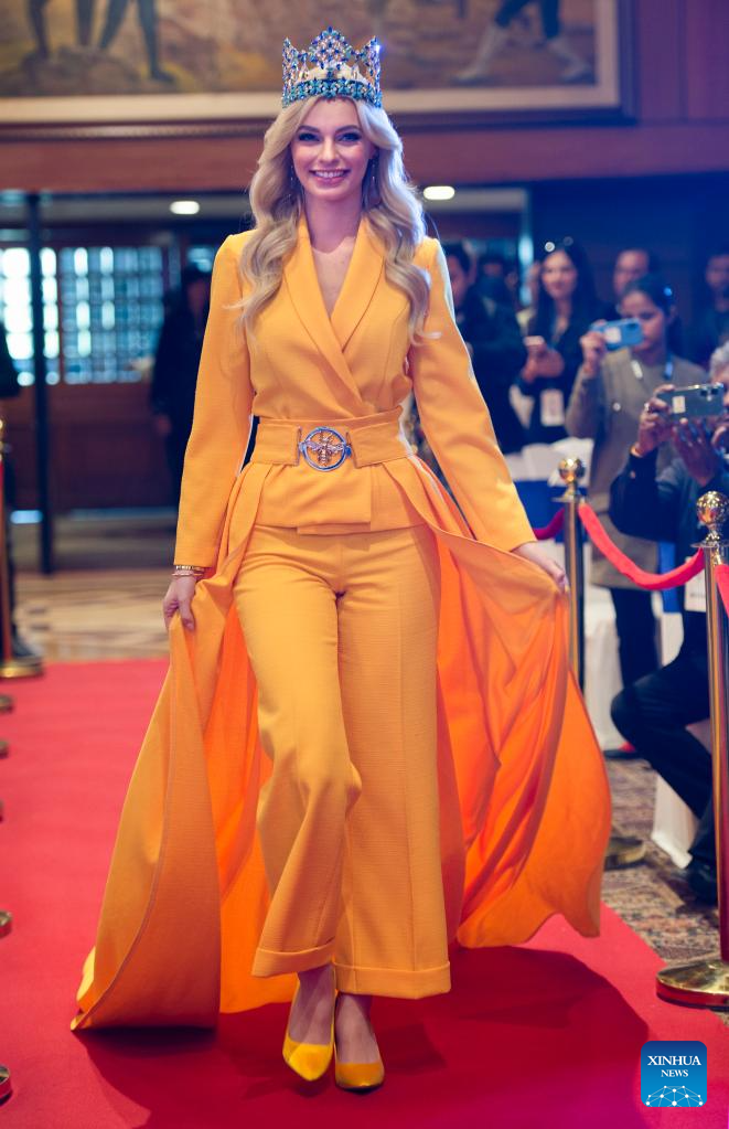The 70th Miss World Karolina Bielawska from Poland arrives at a pre-launch event ahead of the 71st Miss World Festival in New Delhi, India, Feb. 9, 2024. The 71st Miss World Festival will take place between Feb. 18 and March 9 in India. (Xinhua/Javed Dar)
