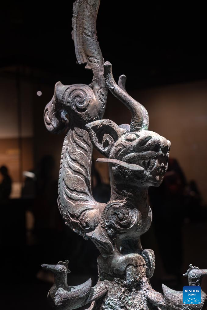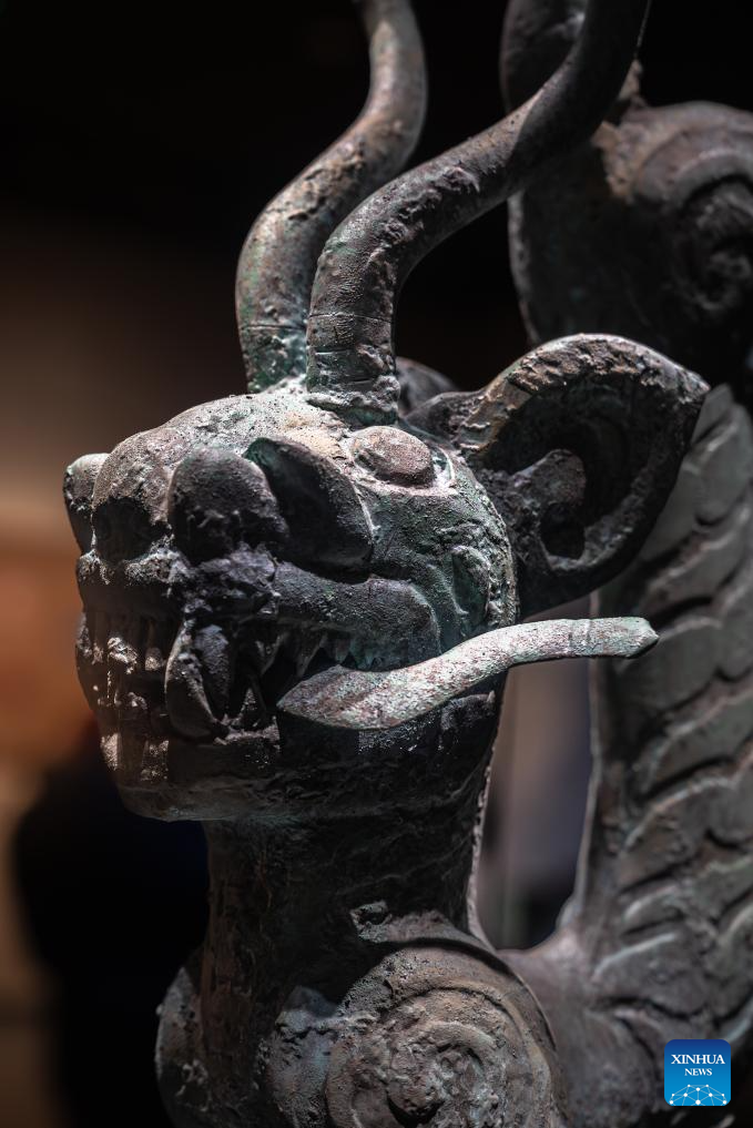 This photo taken on Jan. 26, 2024 shows a dragon-themed bronze exhibit at the Sanxingdui Museum in southwest China's Sichuan Province. Many unearthed cultural relics from the Sanxingdui Ruins site are related to dragon. According to the Chinese zodiac and tradition, the Year of Dragon symbolizes courage, auspiciousness and good luck. (Xinhua/Xue Chen)