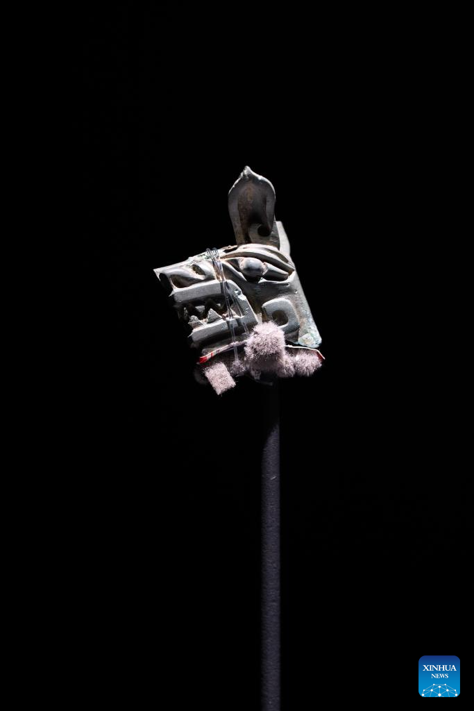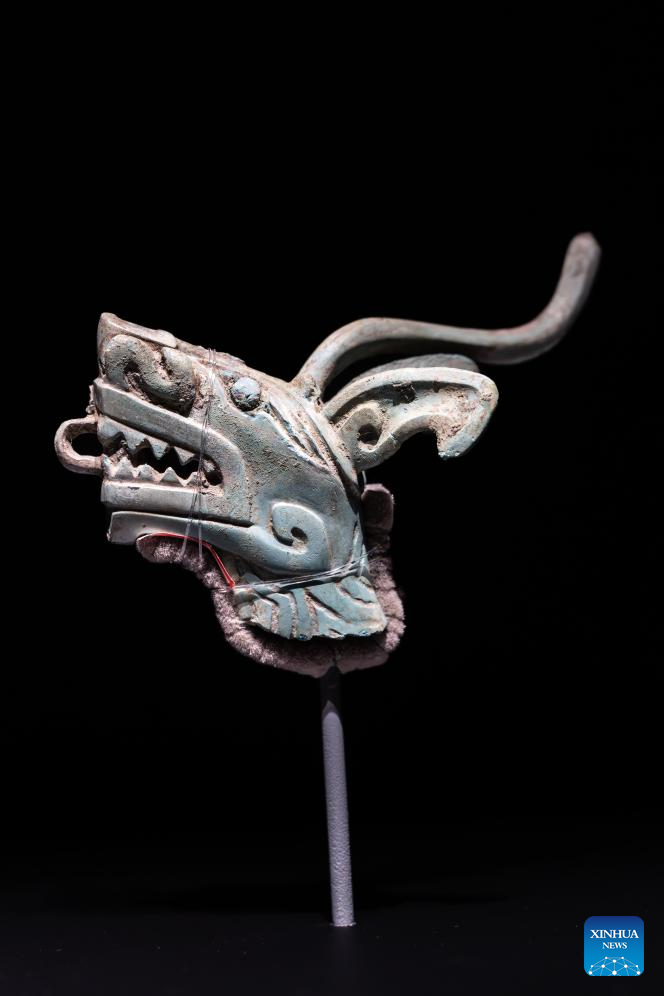 This photo taken on Jan. 26, 2024 shows a bronze dragon head exhibit at the Sanxingdui Museum in southwest China's Sichuan Province. Many unearthed cultural relics from the Sanxingdui Ruins site are related to dragon. According to the Chinese zodiac and tradition, the Year of Dragon symbolizes courage, auspiciousness and good luck. (Xinhua/Xue Chen)
