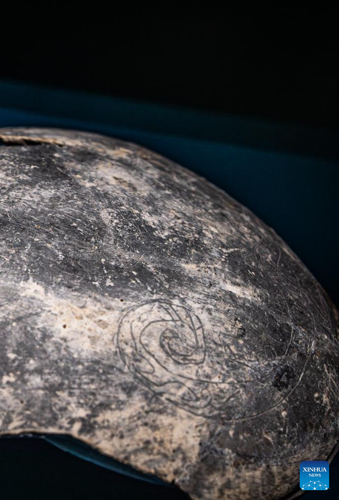 This photo taken on Feb. 7, 2024 shows a piece of pottery ware with a dragon pattern at the Sanxingdui Museum in southwest China's Sichuan Province. Many unearthed cultural relics from the Sanxingdui Ruins site are related to dragon. According to the Chinese zodiac and tradition, the Year of Dragon symbolizes courage, auspiciousness and good luck. (Xinhua/Xue Chen)