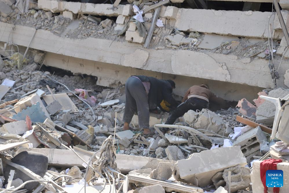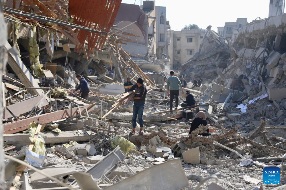 People inspect the rubble after an Israeli airstrike in the southern Gaza Strip city of Rafah, on Feb. 10, 2024. The Israeli army has been launching intensive airstrikes on Rafah city in the south of Gaza since Friday night, killing at least 28 people, reported the state-run Palestine TV. (Photo by Khaled Omar/Xinhua)