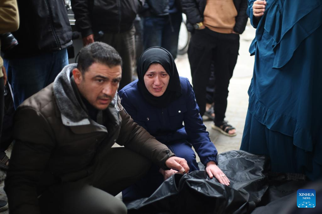 People mourn a victim after an Israeli airstrike in the southern Gaza Strip city of Rafah, on Feb. 10, 2024. The Israeli army has been launching intensive airstrikes on Rafah city in the south of Gaza since Friday night, killing at least 28 people, reported the state-run Palestine TV. (Photo by Khaled Omar/Xinhua)