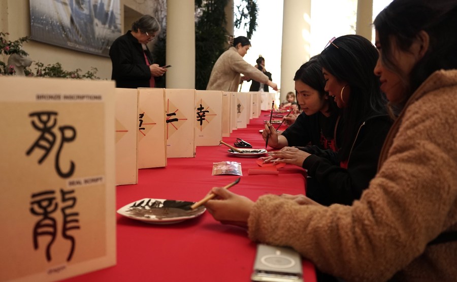 Visitors try their hands on Chinese calligraphy at a Chinese New Year festival at the Huntington Library, Art Museum and Botanical Gardens in Southern California, the United States, Feb. 10, 2024. (Photo by Zeng Hui/Xinhua)