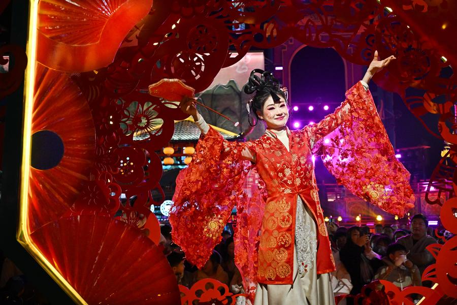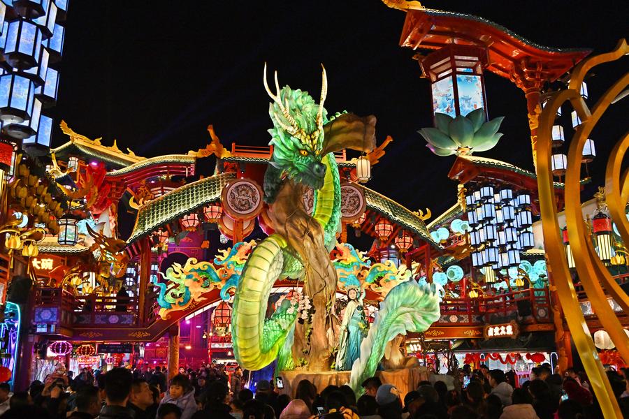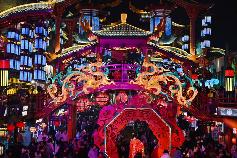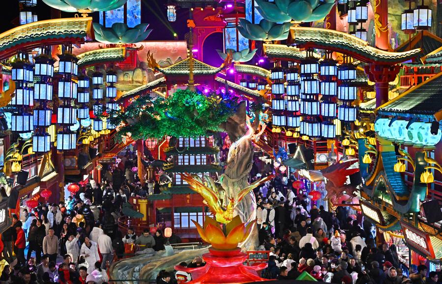 QINGDAO, Feb. 11 (Xinhua) -- Light installations and stage performances have been arranged at a scenic spot in Chengyang District of Qingdao to attract more nighttime visitors during the Spring Festival holiday.