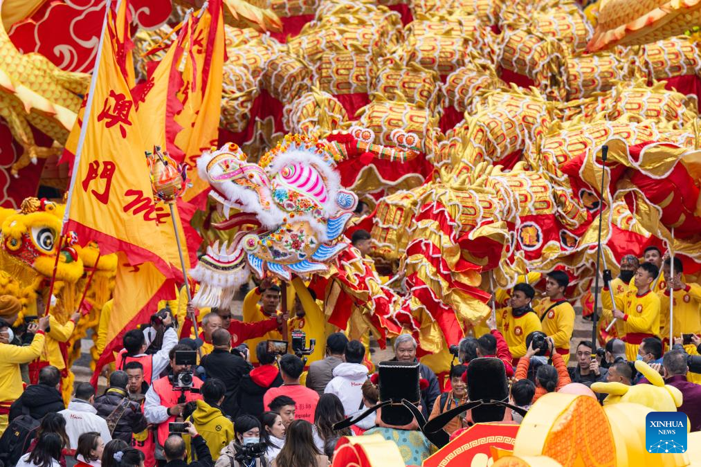 Artists perform a dragon dance to celebrate the Chinese Lunar New Year at the Senado Square in south China's Macao on Feb. 10, 2024. On the first day of the Year of the Dragon, touring performances organized by the Macao Government Tourism Office were staged at the Ruins of St. Paul's and the Senado Square to celebrate the Chinese Lunar New Year. A 238-meter-long "dancing golden dragon" also toured multiple major scenic spots of Macao. (Xinhua/Cheong Kam Ka)