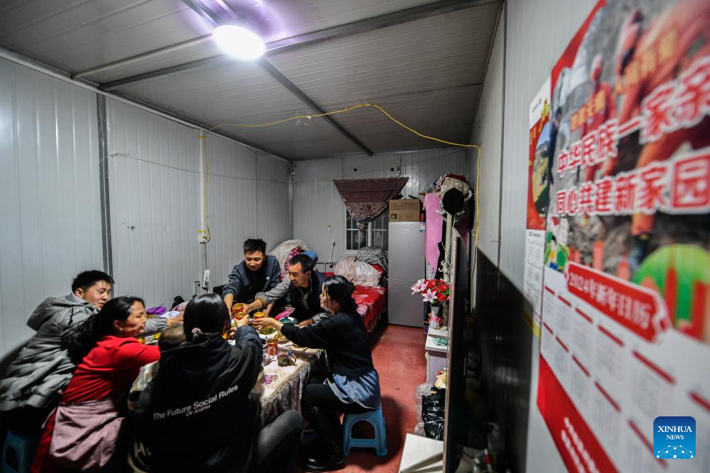 People have a dinner at a relocation site on the eve of Chinese Lunar New Year in Tuanjie Village of Liuji Township, Jishishan County, northwest China's Gansu Province, Feb. 9, 2024. After a 6.2-magnitude earthquake that jolted northwest China's Gansu Province in December 2023, more than 16,000 prefabricated houses were built for the quake-affected residents. Atmosphere of Chinese Lunar New Year was witnessed at relocation sites on the eve of the festival. (Xinhua/Lang Bingbing)