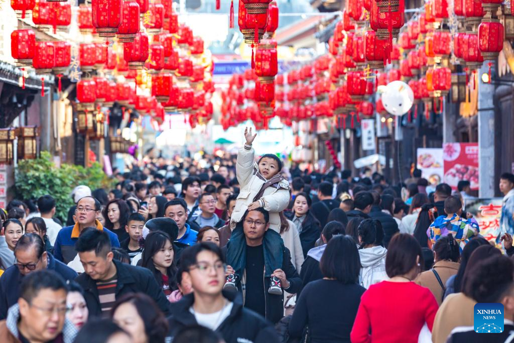 Tourists have fun at a historic and cultural street in Anshun City of southwest China's Guizhou Province, Feb. 10, 2024. As the festive mood reached its peak, China on Saturday ringed in the Chinese Lunar New Year, or the Spring Festival. Regarded as the most celebrated holiday among Chinese, it signifies a time of joyful family reunions and a slew of cultural events. (Photo by Chen Xi/Xinhua)