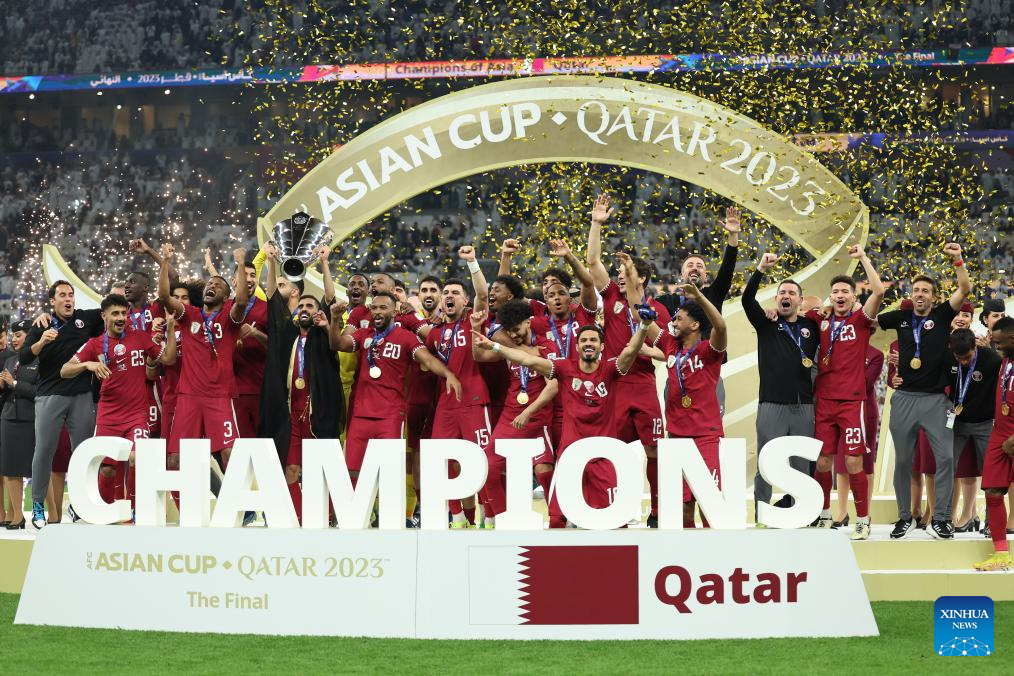 Players of Qatar celebrate with the trophy during the awarding ceremony after the final between Jordan and Qatar at AFC Asian Cup Qatar at Lusail Stadium in Lusail, Qatar, Feb. 10, 2024. (Xinhua/Jia Haocheng)