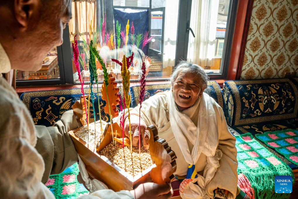 Sichod Wangmo (R) eats chema, roasted barley and fried wheat grain in a two-tier rectangular wooden box, at Jiagen Village in Damxung County, southwest China's Xizang Autonomous Region, Feb. 10, 2024. (Xinhua/Tenzin Nyida)