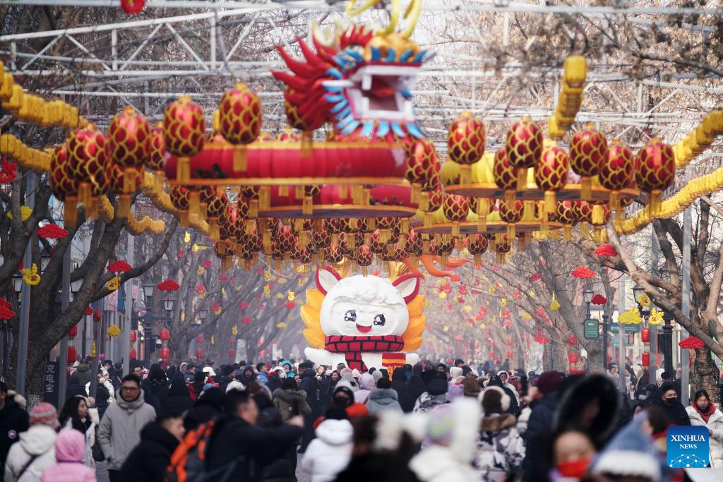 A dragon-shaped lantern installation is seen at the Central Street in Harbin, northeast China's Heilongjiang Province on Feb. 10, 2024. From China's northernmost city, Mohe, to Fuyuan City in the easternmost part of the country, from the "Snow Town" scenic spot to the "ice city" of Harbin, the top winter destinations in northeast China's Heilongjiang Province have attracted numerous tourists from all over the country to spend the Spring Festival holiday. (Xinhua/Wang Jianwei)