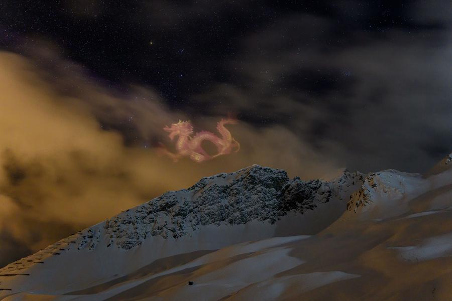 With meticulous precision, the artist projected a majestic dragon onto the towering cliffs and thick clouds, its sinuous form undulating against the stark backdrop of the alpine landscape.
