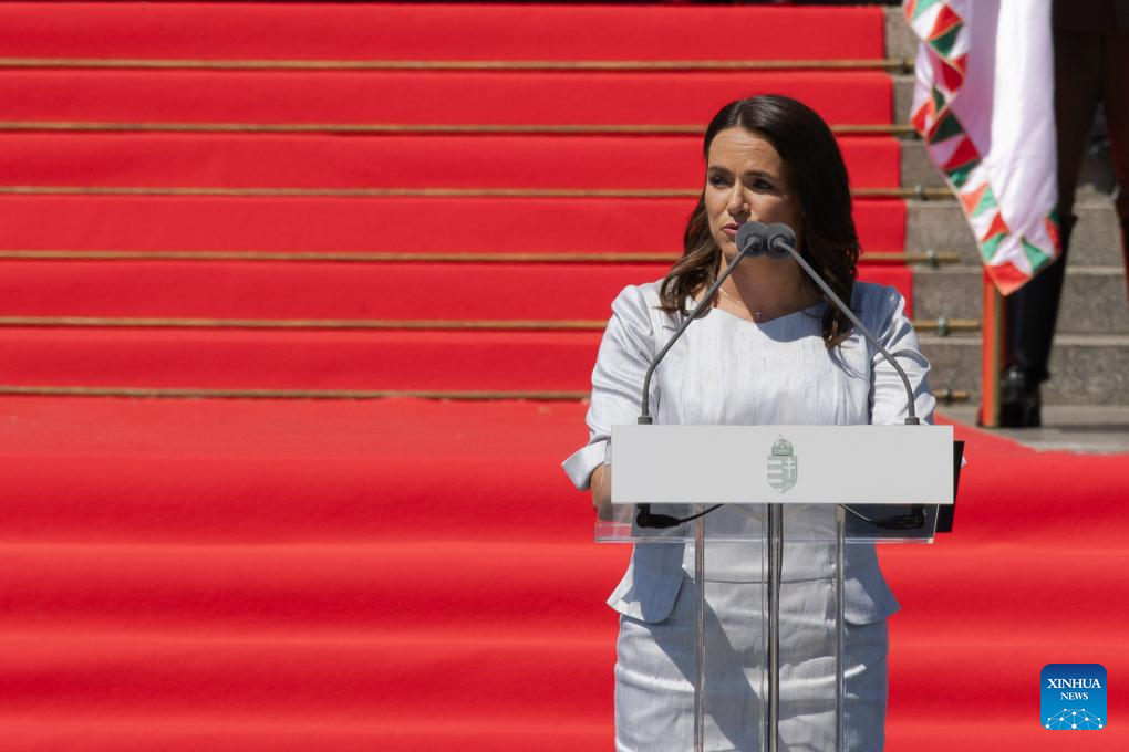 This file photo taken on May 14, 2022 shows Katalin Novak (front, L) attending her inauguration ceremony in front of the Hungarian Parliament in Budapest, Hungary. Hungarian President Katalin Novak resigned from office on Saturday, following a child abuse pardon scandal. (Photo by Attila Volgyi/Xinhua)