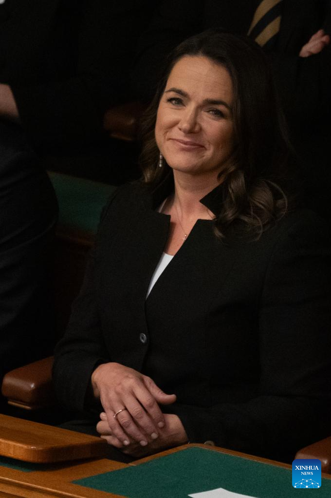 This file photo taken on March 10, 2022 shows Katalin Novak attending the oath-taking ceremony in the Hungarian Parliament, Budapest, Hungary. Hungarian President Katalin Novak resigned from office on Saturday, following a child abuse pardon scandal. (Photo by Attila Volgyi/Xinhua)