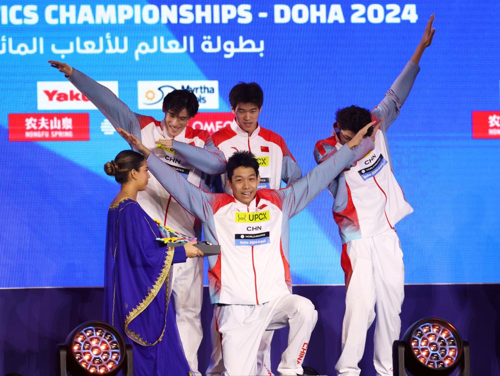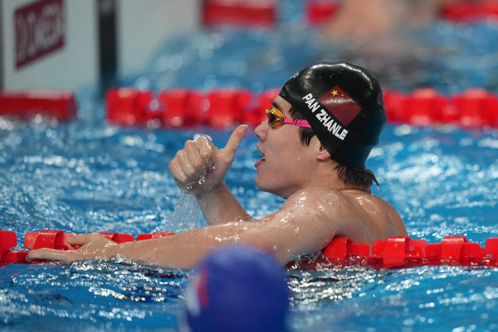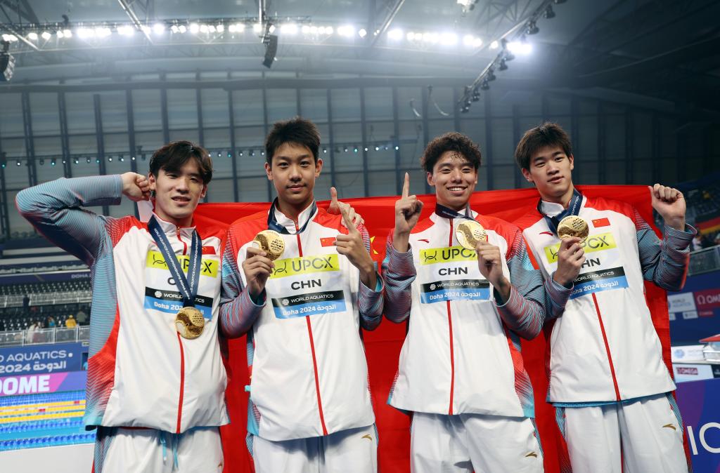 Gold medalists Wang Haoyu, Zhang Zhanshuo, Ji Xinjie and Pan Zhanle (L to R) of Team China celebrate during the awarding ceremony for the men's 4X100m freestyle relay of swimming event at the World Aquatics Championships 2024 in Doha, Qatar, Feb. 11, 2024. (Xinhua/Luo Yuan)Gold medalists Wang Haoyu(L, top), Zhang Zhanshuo (Bottom), Ji Xinjie (R, top) and Pan Zhanle (C, top) of Team China celebrate during the awarding ceremony for the men's 4X100m freestyle relay of swimming event at the World Aquatics Championships 2024 in Doha, Qatar, Feb. 11, 2024. (Xinhua/Luo Yuan)Pan Zhanle of Team China celebrates after the awarding ceremony for the men's 4X100m freestyle relay of swimming event at the World Aquatics Championships 2024 in Doha, Qatar, Feb. 11, 2024. (Xinhua/Xue Yuge)Pan Zhanle of Team China celebrates after the men's 4X100m freestyle relay final of swimming event at the World Aquatics Championships 2024 in Doha, Qatar, Feb. 11, 2024. (Xinhua/Xue Yuge)Pan Zhanle of Team China competes during the men's 4X100m freestyle relay final of swimming event at the World Aquatics Championships 2024 in Doha, Qatar, Feb. 11, 2024. (Xinhua/Xue Yuge)