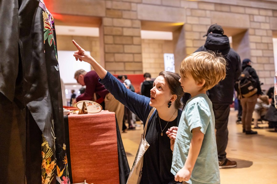 A woman and a child marvel at traditional Chinese dress at the Philadelphia Museum of Art Lunar New Year Festival in Philadelphia, the United States, on Feb. 11, 2024. (Photo by Winston Zhou/Xinhua)