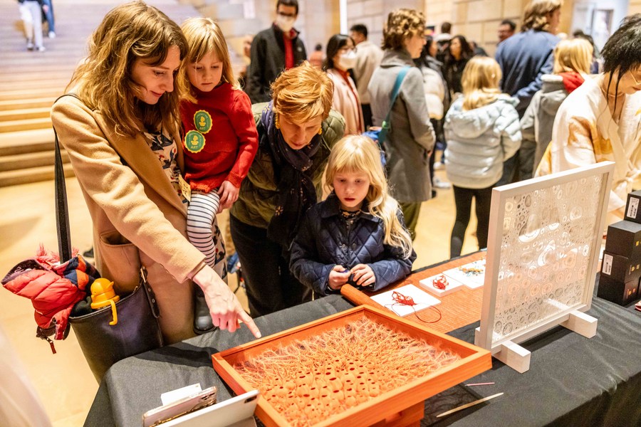 Visitors look at an embroidery artwork at the Philadelphia Museum of Art Lunar New Year Festival in Philadelphia, the United States, on Feb. 11, 2024. (Photo by Winston Zhou/Xinhua)