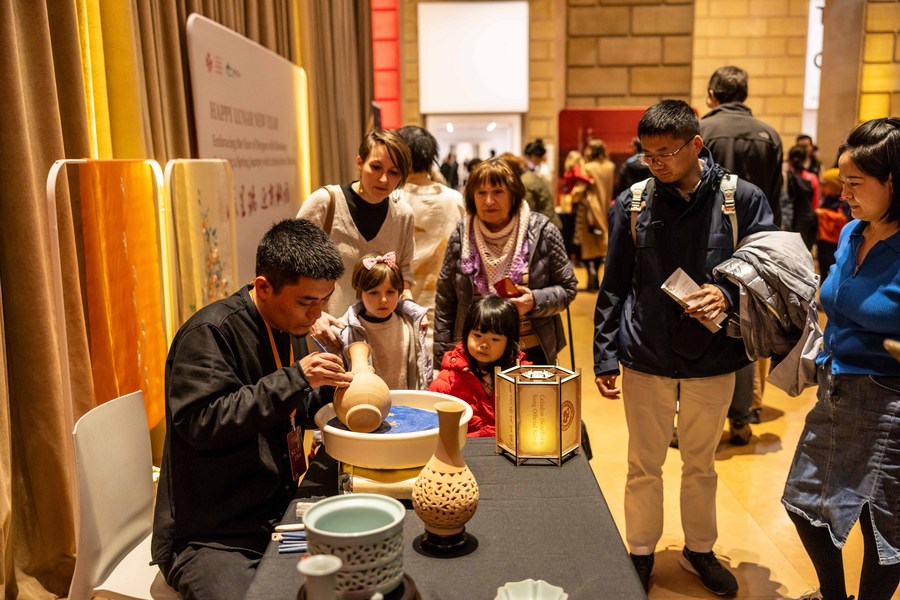 A Chinese artisan demonstrates porcelain making at the Philadelphia Museum of Art Lunar New Year Festival in Philadelphia, the United States, on Feb. 11, 2024. (Photo by Winston Zhou/Xinhua)