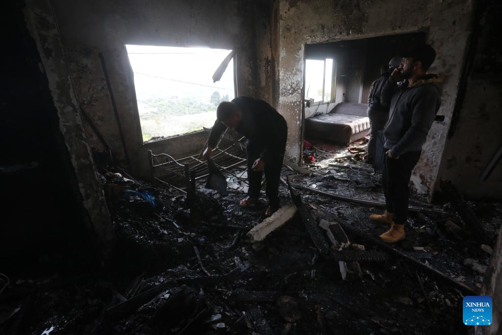 People inspect a building damaged in an Israeli raid in the West Bank city of Jenin, on Feb. 13, 2024. Local Palestinian sources said that during the past hours, the Israeli army stormed a number of West Bank areas, including Qalqilya and the Jenin refugee camp, destroying roads and vehicles belonging to Palestinians during the raids. (Photo by Nidal Eshtayeh/Xinhua)