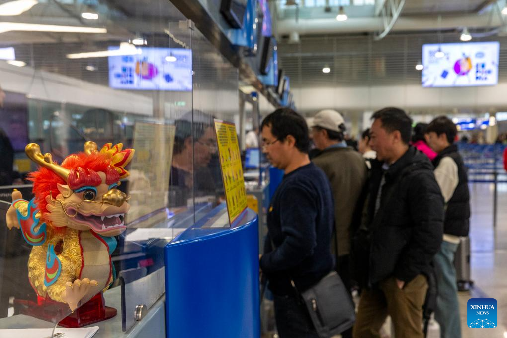 A Chinese dragon-shaped desktop decoration is pictured at the Athens International Airport in Athens, Greece, on Feb. 12, 2024. The Athens International Airport welcomed passengers to China on Monday with a performance themed on the Chinese New Year. (Xinhua/Marios Lolos)