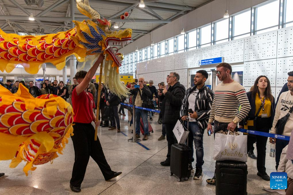 Passengers watch a dragon dance performance at the Athens International Airport in Athens, Greece, on Feb. 12, 2024. The Athens International Airport welcomed passengers to China on Monday with a performance themed on the Chinese New Year. (Xinhua/Marios Lolos)