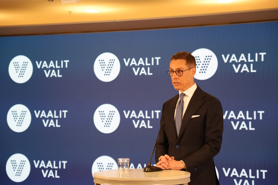 HELSINKI, Feb. 12 (Xinhua) -- The presidential candidate for the National Coalition Alexander Stubb narrowly won the Finnish presidential election Sunday night.
