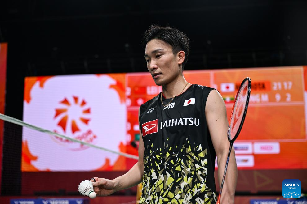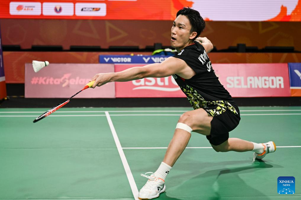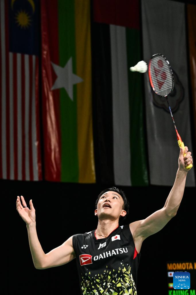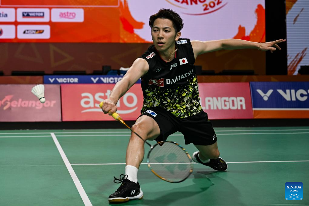 Momota Kento of Japan competes against Min Htet Kaung of Myanmar during the men's team group stage between Japan and Myanmar at the Badminton Asia Team Championships 2024 in Shah Alam, Selangor, Malaysia, Feb. 13, 2024. (Xinhua/Cheng Yiheng)