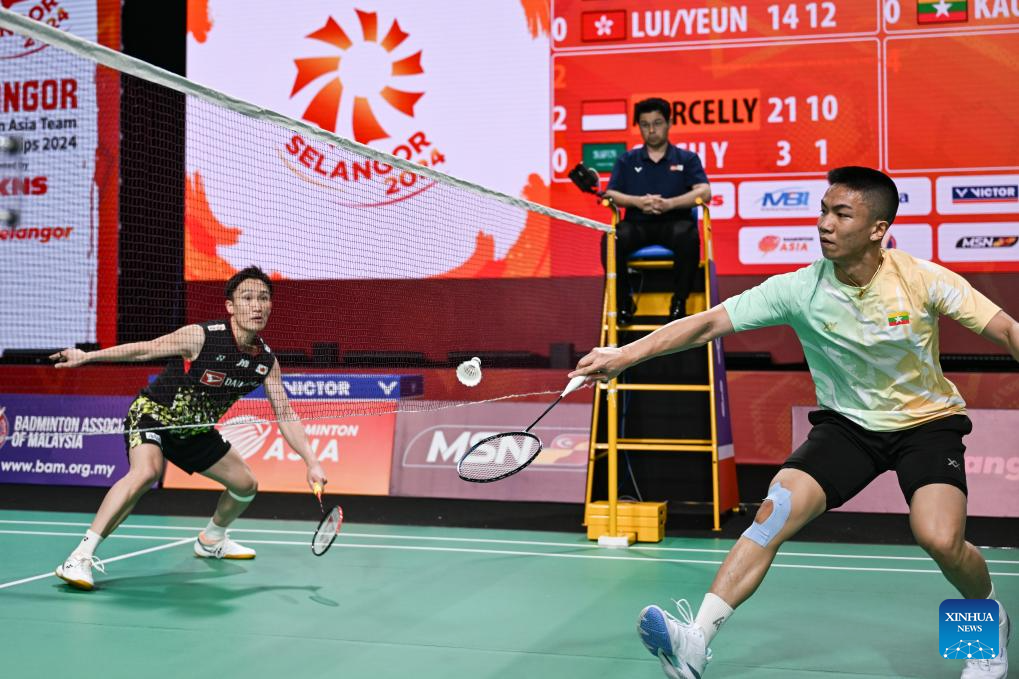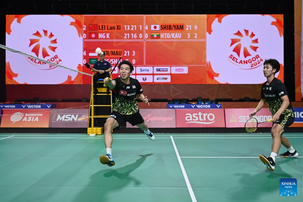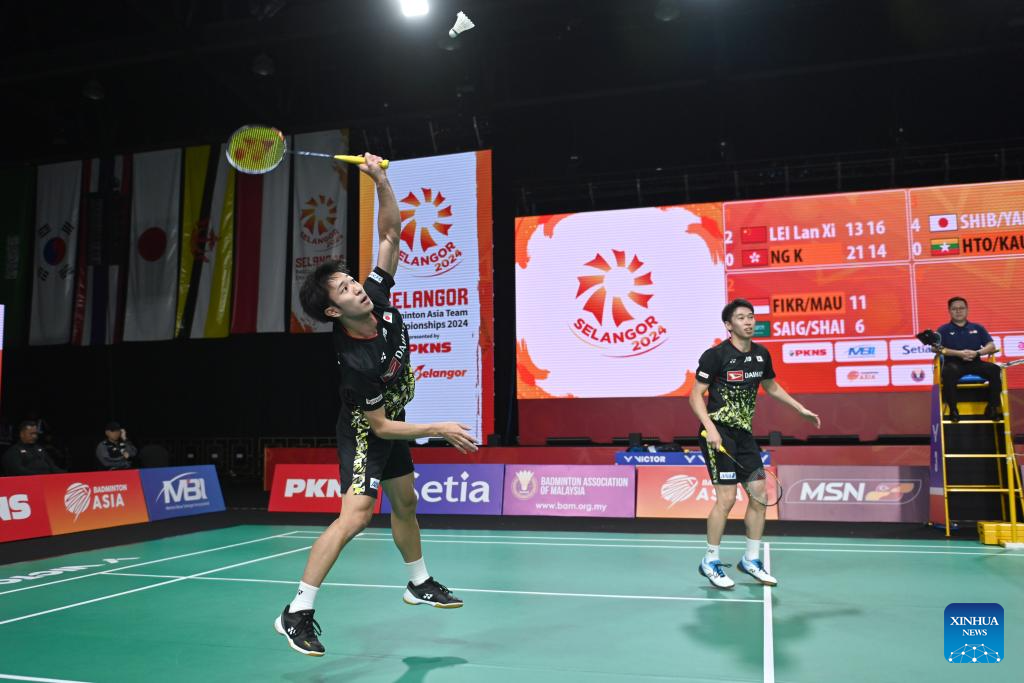 Shibata Kazuki/Yamada Naoki (L) of Japan compete against Zaw Lin Htoo/Min Htet Kaung of Myanmar during the men's team group stage between Japan and Myanmar at the Badminton Asia Team Championships 2024 in Shah Alam, Selangor, Malaysia, Feb. 13, 2024. (Photo by Chong Voon Chung/Xinhua)