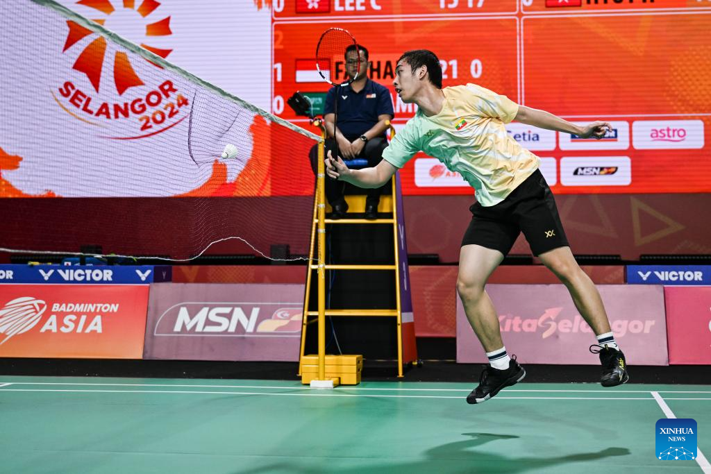 Watanabe Koki of Japan competes against Phone Pyae Naing of Myanmar during the men's team group stage between Japan and Myanmar at the Badminton Asia Team Championships 2024 in Shah Alam, Selangor, Malaysia, Feb. 13, 2024. (Xinhua/Cheng Yiheng)