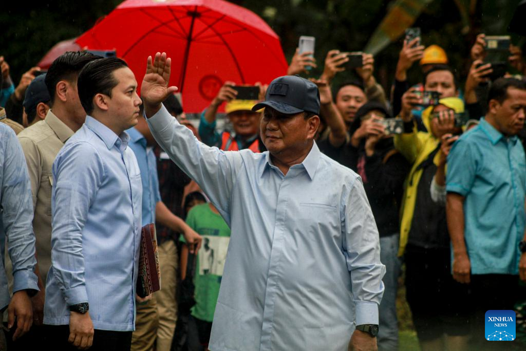Presidential candidate Prabowo Subianto greets people at the No. 33 polling station in Bogor, Indonesia, Feb. 14, 2024. Prabowo Subianto has won Indonesia's presidential election as is shown in various quick counts that came out on Wednesday night. (Photo by Sandika Fadilah/Xinhua)