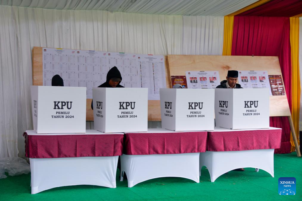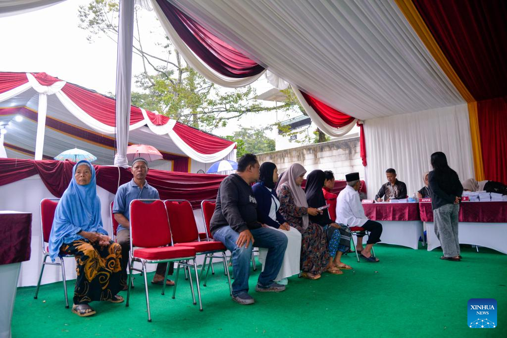 Voters register on site to receive ballots at the No. 35 polling station in Bogor, Indonesia, Feb. 14, 2024. Voting for Indonesia's general elections officially began Wednesday morning, according to the country's General Elections Commission (KPU). (Xinhua/Xu Qin)
