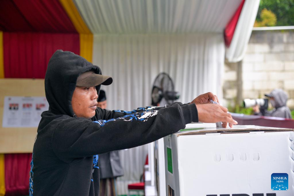 A voter casts his ballot at the No. 35 polling station in Bogor, Indonesia, Feb. 14, 2024. Voting for Indonesia's general elections officially began Wednesday morning, according to the country's General Elections Commission (KPU). (Xinhua/Xu Qin)
