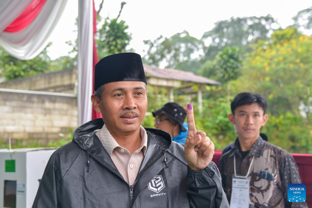 A voter shows his finger after casting his ballot at the No. 35 polling station in Bogor, Indonesia, Feb. 14, 2024. Voting for Indonesia's general elections officially began Wednesday morning, according to the country's General Elections Commission (KPU). (Xinhua/Xu Qin)