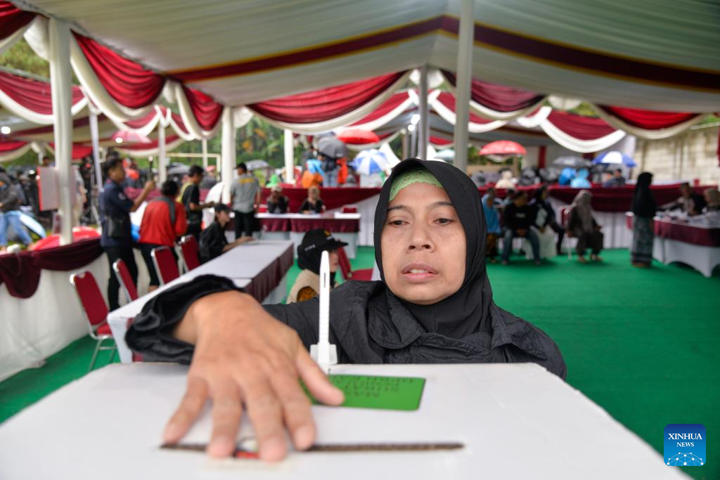 A voter casts her ballot at the No. 35 polling station in Bogor, Indonesia, Feb. 14, 2024. Voting for Indonesia's general elections officially began Wednesday morning, according to the country's General Elections Commission (KPU). (Xinhua/Xu Qin)
