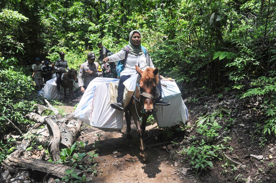 Staff members deliver ballot boxes to remote areas on horse back at Meru Betiri National Park in Jember, East Java, Indonesia, on Feb. 13, 2024. (Photo by Sahlan Kurniawan/Xinhua)